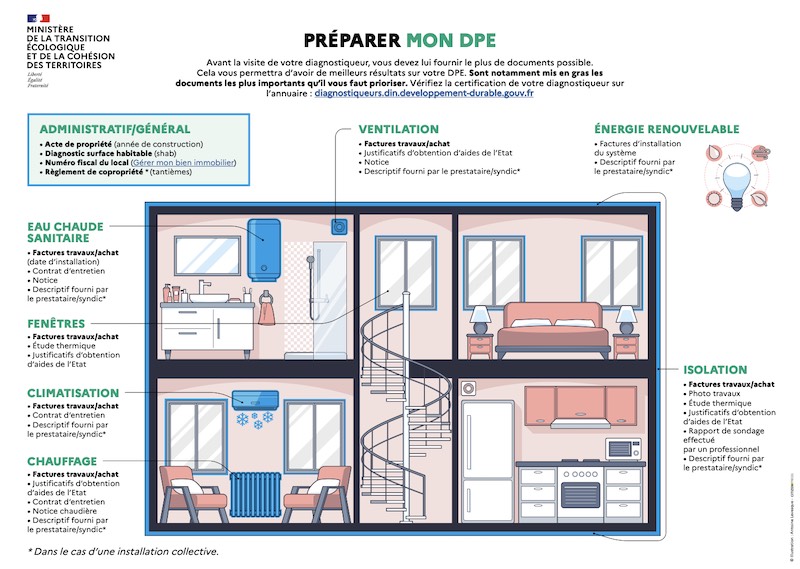 Opgedeeld in verschillende rubrieken, geeft het DPE ook aanbevelingen om het verbruik en de uitstoot van een woning te verbeteren, evenals een schatting van de kosten van de uit te voeren werkzaamheden. Deze aanbevelingen zijn niet verplicht, maar worden sterk aanbevolen. De DPE-rating moet sinds 1 juli 2021 op vastgoedadvertenties verschijnen.