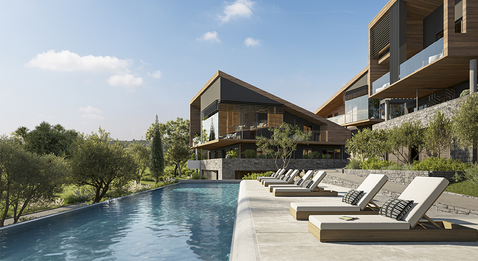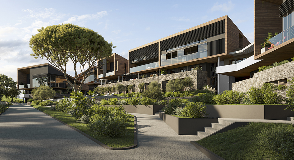 Dit moderne project zoekt de harmonie met zijn natuurlijke omgeving: zachte kleurtonen, eenvoudige lijnen en veel licht creëren een verkwikkende woonomgeving. Buitenruimtes zijn ontworpen voor welzijn; de residentie biedt een zwembad en sfeervolle groenaanleg met olijfbomen, citrusbomen en exotische beplanting — een rustgevende, Mediterrane sfeer.