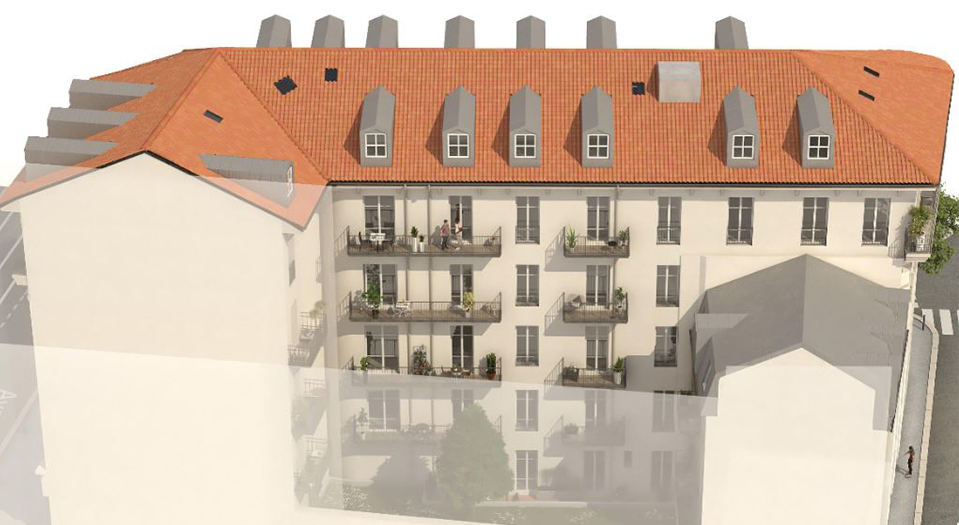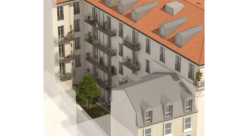 Het plan omvat meer dan renovatie en een extra verdieping: er wordt een volledig beplante binnenplaats aangelegd, een echte vredige oase in het centrum. Zowel duplexen als gelijkvloerse appartementen openen naar deze groene binnenplaats, wat zorgt voor rustige, lichte woonruimtes ver weg van het stadsrumoer, terwijl het centrum op wandelafstand blijft.