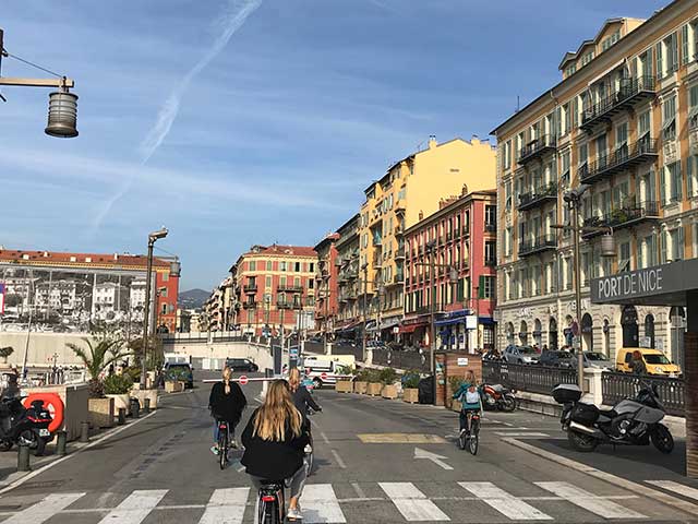 Terwijl we verder door Nice rijden krijg ik een steeds grotere glimlach; dit is echt leuk om te doen. Je ziet veel meer van de stad dan in de auto of lopend; op de fiets door Nice maakt de stad voor de bezoeker een stuk handzamer. We rijden via de antiekbuurt naar de haven waar we even stil staan voor een slokje water. Precies op dat moment klinkt er een harde doffe klap; alsof iemand met carbid schiet. Dit wordt blijkbaar iedere dag gedaan in Nice, precies om 12.00 uur. We luisteren ademloos naar het verhaal van een rijke edelman en zijn vrouw die altijd maar in Nice aan het winkelen was. Wat dit precies met die doffe knal te maken heeft, hoort u natuurlijk van Willemijn of haar collega’s als u met Holland Bikes door Nice fietst.