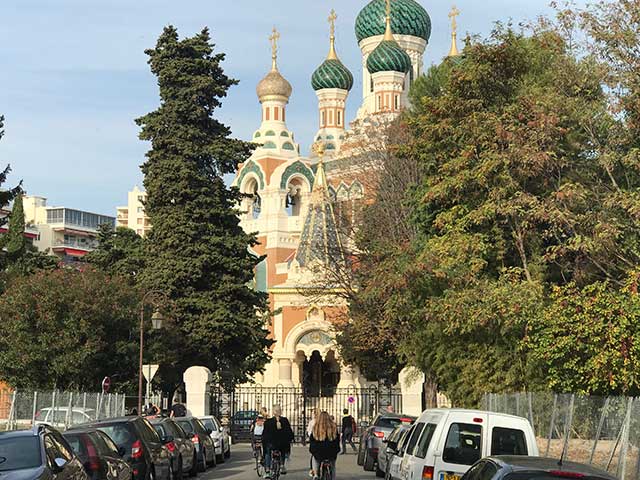 De fietstocht duurt gemiddeld drie uur en u kunt kiezen uit verschillende routes. Wij rijden verder langs de gerenoveerde boulevard en staan stil bij diverse musea die verstopt zijn in prachtige landhuizen. Ooit kwam de zee tot aan de voordeur; inmiddels zijn de huizen officieel Franse monumenten en opgesteld voor het publiek. Dan fietsen we een beetje het achterland in en komen zo in de Russische buurt. Nice is groot en internationaal beroemd geworden door aristocraten uit met name Engeland en Rusland die hier kwamen overwinteren. Totaal onverwacht staan we ineens oog in oog met een Russische kerk, het lijkt wel uit een sprookje. We mogen gratis naar binnen en kijken ook hier onze ogen uit; wat jammer eigenlijk dat we hier al twaalf jaar wonen en dit nog steeds niet hadden gezien.